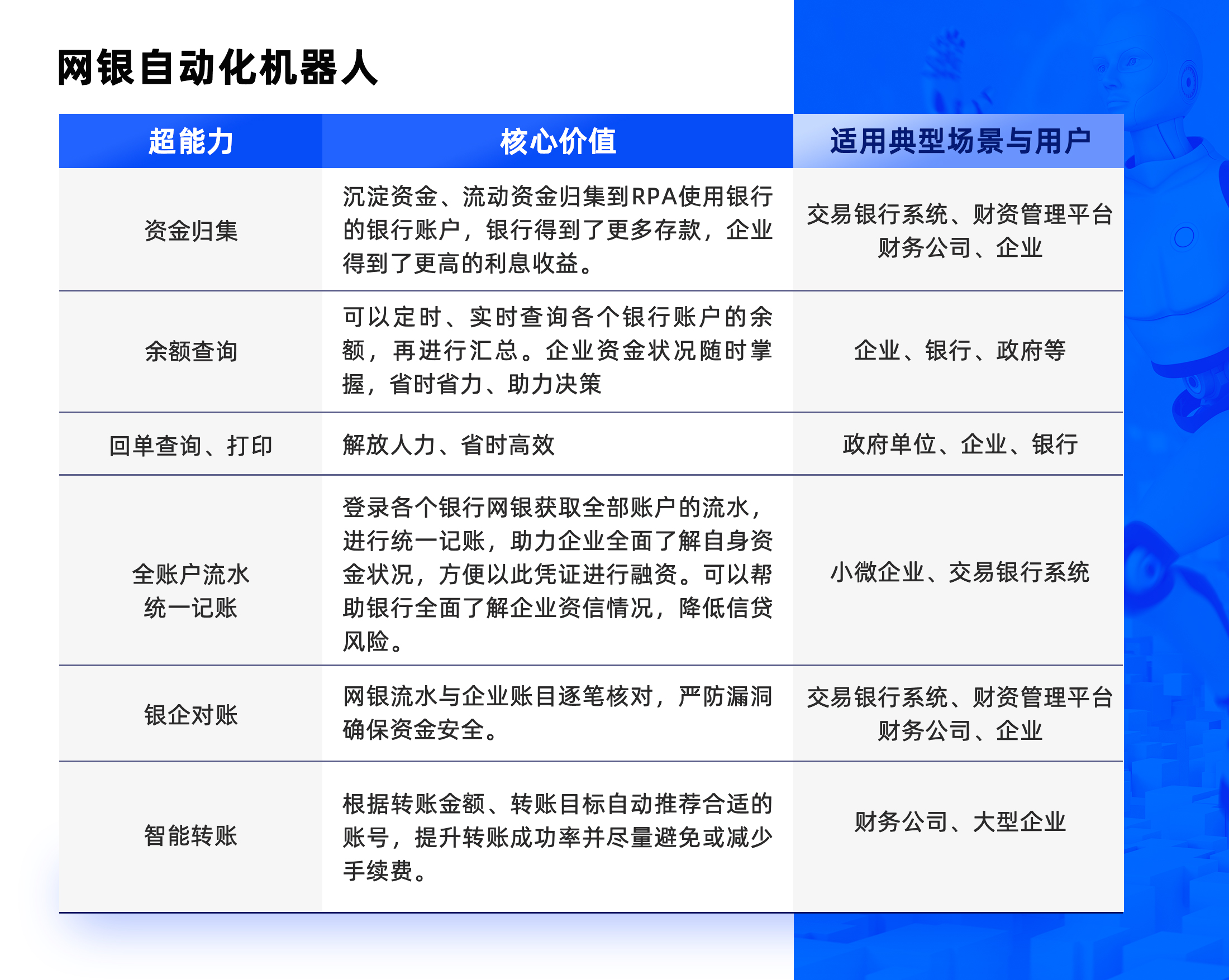 也许这么说有些泛泛,好像其他厂商也可以做到,那你们的RPA到底有哪些亮点呢?姑且就给这个RPA起一个名字吧:网银自动化机器人!下面就来盘点一下这个机器人带来的超能力!??????