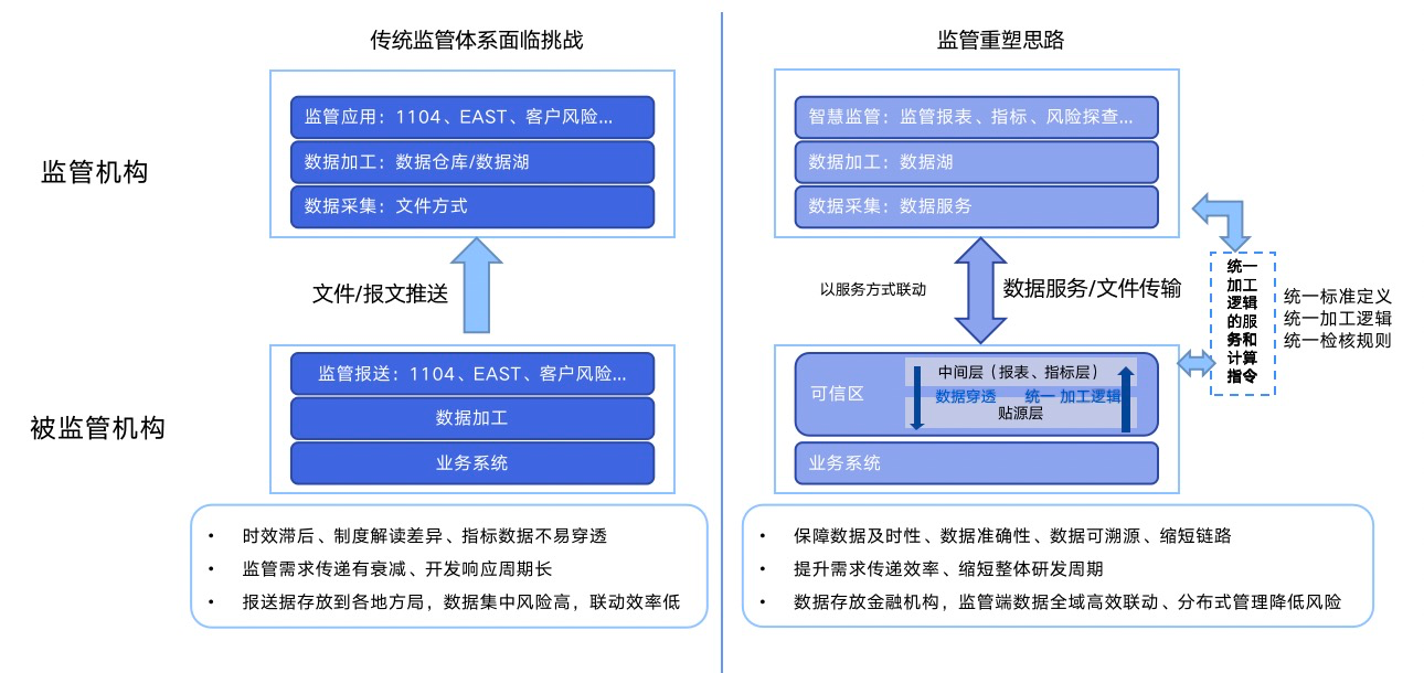 一表通2.0对传统报送体系的影响显而易见。首先,时效性提高,试点要求“T+1”报送,对金融机构的数据质量体系提出很高要求;其次,用不同试点验证一表通对EAST、1104的“一键转”,未来对EAST、客户风险、1104报送都产生影响;再者,监管机构通过“可信区”检视全国各银行各层级监管明细数据,实现了“智慧监管”;最后,实现了“分布式金融监管”,监管数据的存储、计算在机构端,机构端具备“边缘计算”和“监管数据服务”能力。