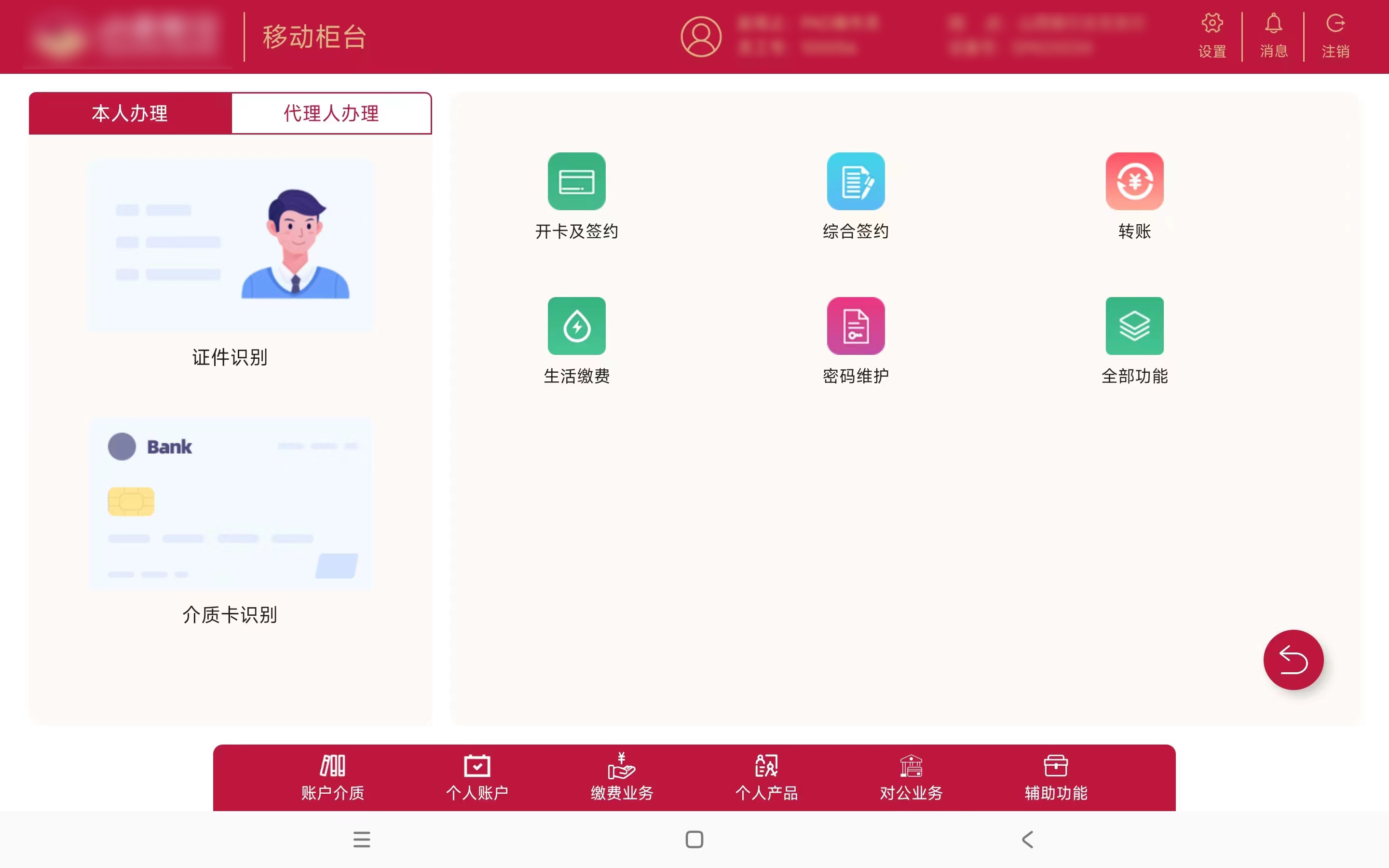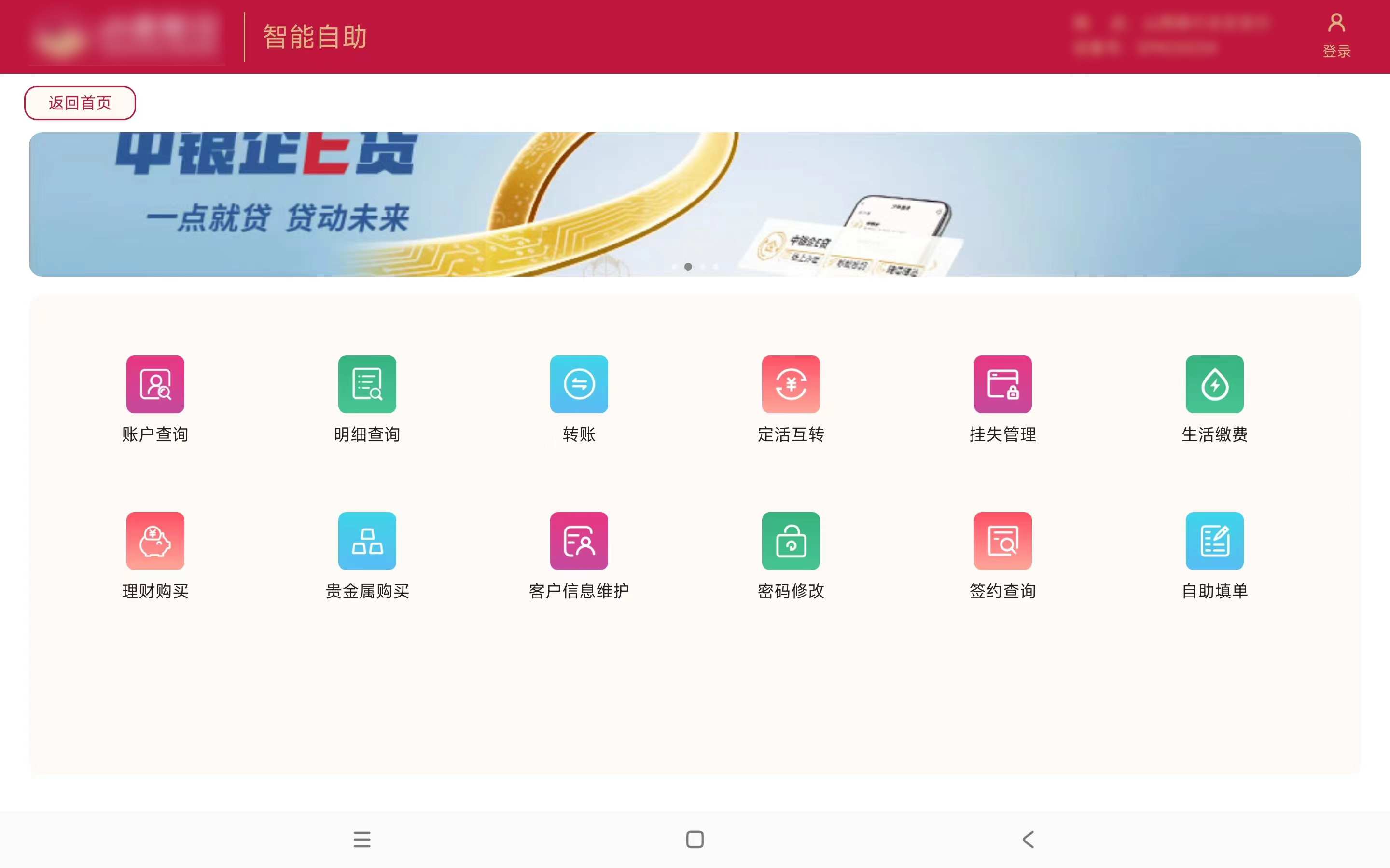 客户自助模式下,放置到厅堂内,为客户提供一个全新自助业务办理渠道。客户可办理如理财购买、转账、客户信息维护、生活缴费、定活互转等业务。