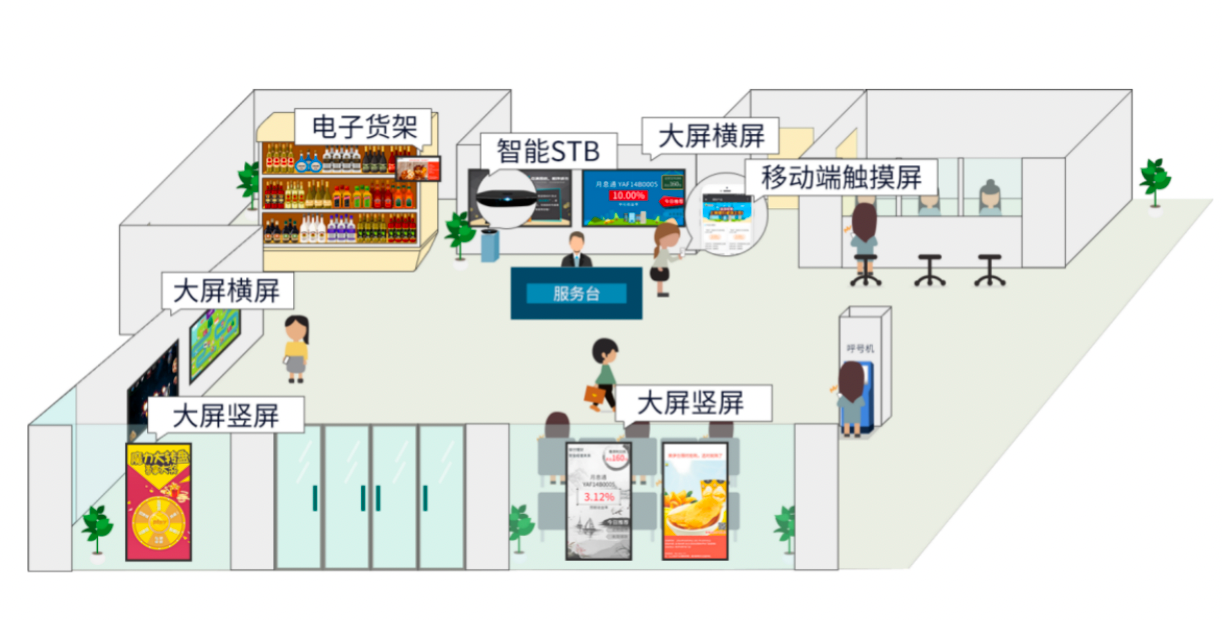 查找信息最简单的方式就是抬头可见。网点大屏软件客户端是通过在各大网点营业厅安装液晶显示屏和播放终端来代替原有的led电子显示屏,建立一套智能设备管控及信息发布平台,实现终端互动,管理有序,形成增值服务的载体,从而有效的提升企业文化的宣传、品牌形象的提升,为网点的数字化建设添砖加瓦,有效的提高客户对银行产品、服务的认知度、减低客户等待服务的心里等待时间,以改善客户满意度,从而获得更高的客户贡献度。