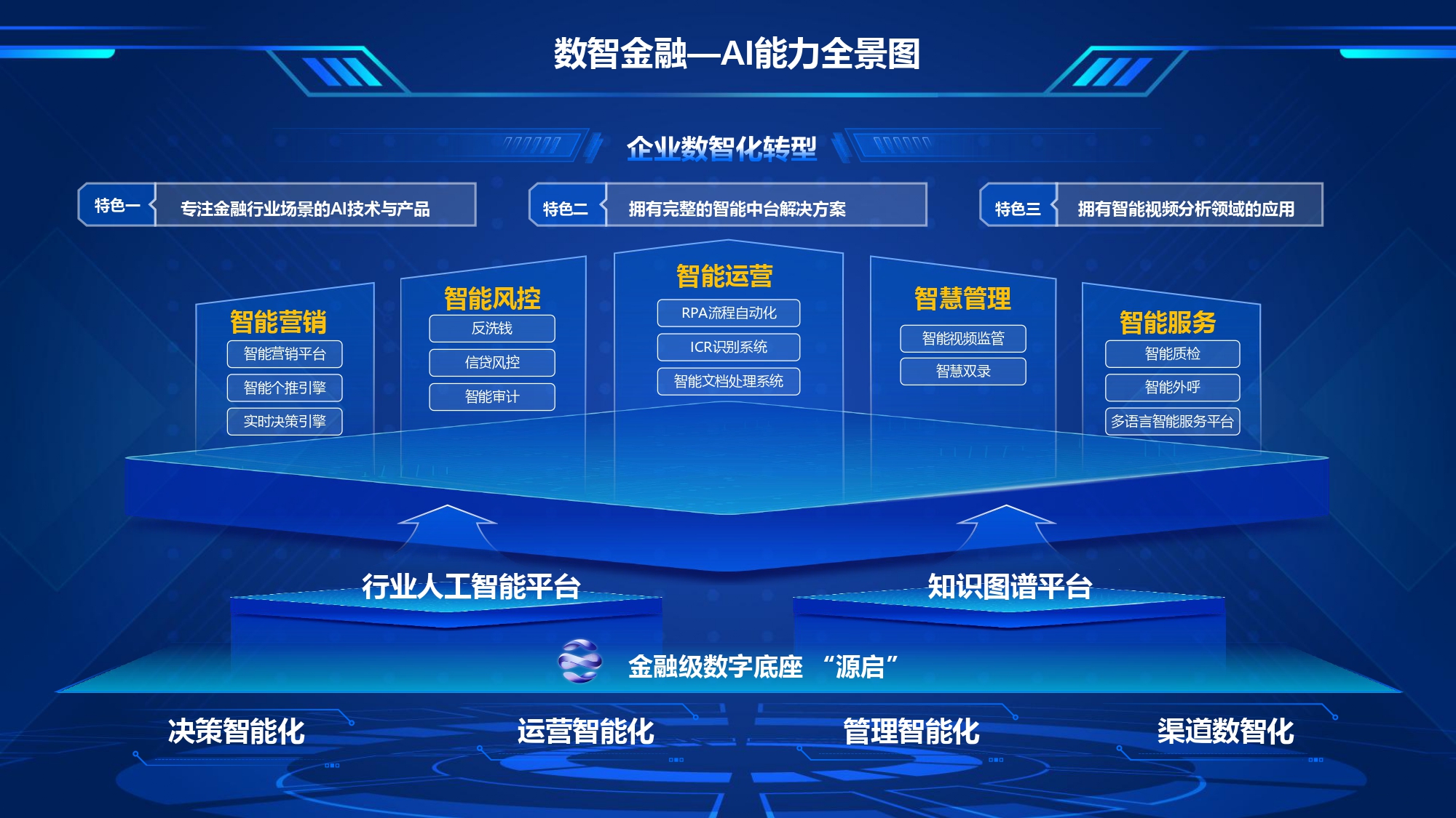 在人工智能领域,中电金信以“源启”为支撑,形成了“两大平台+五大应用场景”的产品格局,通过行业人工智能平台、知识图谱平台两大平台来生产AI场景算法和业务知识图谱,并将 AI 能力嵌入到智能营销、智能风控、智能运营、智慧管理和智能服务等应用中,支撑金融行业决策智能化、运营智能化、管理智能化和渠道数智化,带来全场景服务能力和全栈解决方案,助力金融行业数智化转型。
