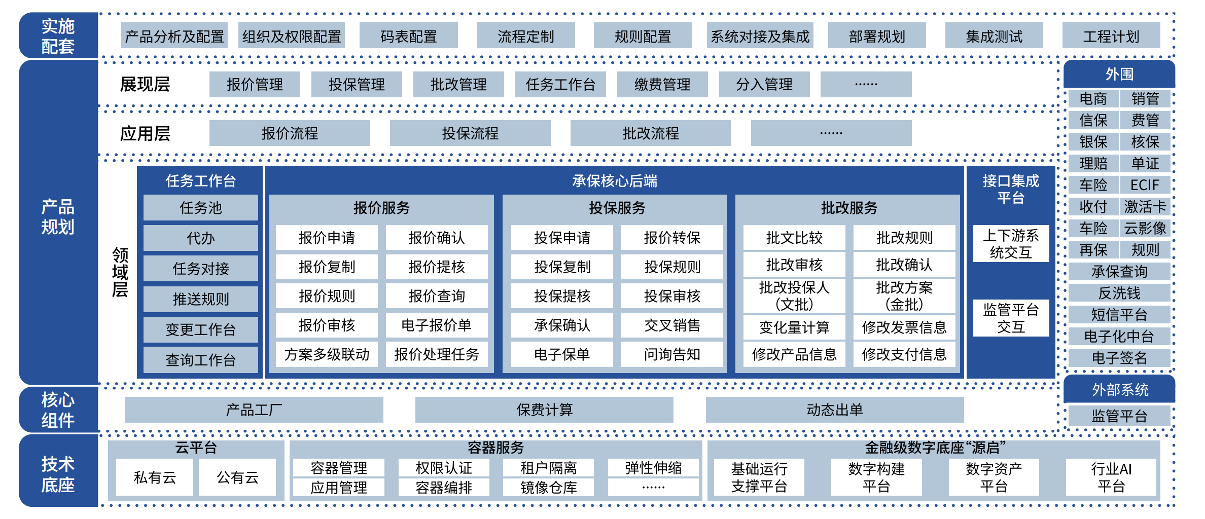 建立业务中台和数据中台,沉淀标准化作业能力,形成财险核心系统的基础能力域,以支撑财险公司对报价、投保、保费计算等业务场景的敏捷实现与部署。