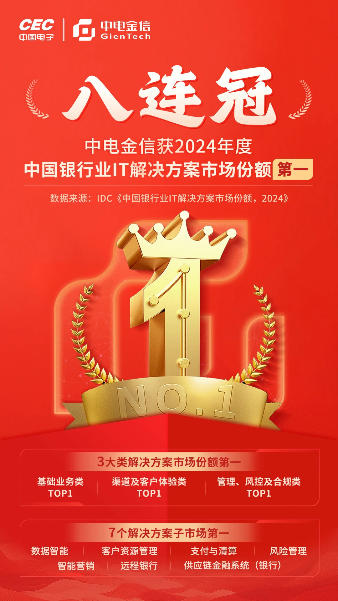 7月1日,全球权威的IT市场研究和咨询机构IDC发布《中国银行业IT解决方案市场份额,2024》报告。《报告》显示,中电金信连续第八年蝉联中国银行业IT解决方案市场份额TOP1,并在基础业务、渠道及客户体验,以及管理、风控及合规三大类解决方案市场份额第一。在细分领域,中电金信一举包揽七项解决方案子市场冠军,涵盖数据智能、客户资源管理、支付清算、风险管理、远程银行、智能营销、供应链金融系统(银行),持续巩固行业领导地位。