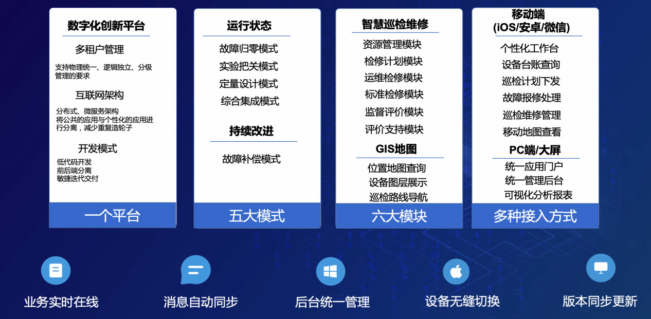 形成了资产设备运行维护一线业务抓手:巡检工作管理自动化,巡检记录无纸化,巡检设备状态检测自动化,巡视内容专家库化,巡视到位监督自动化;