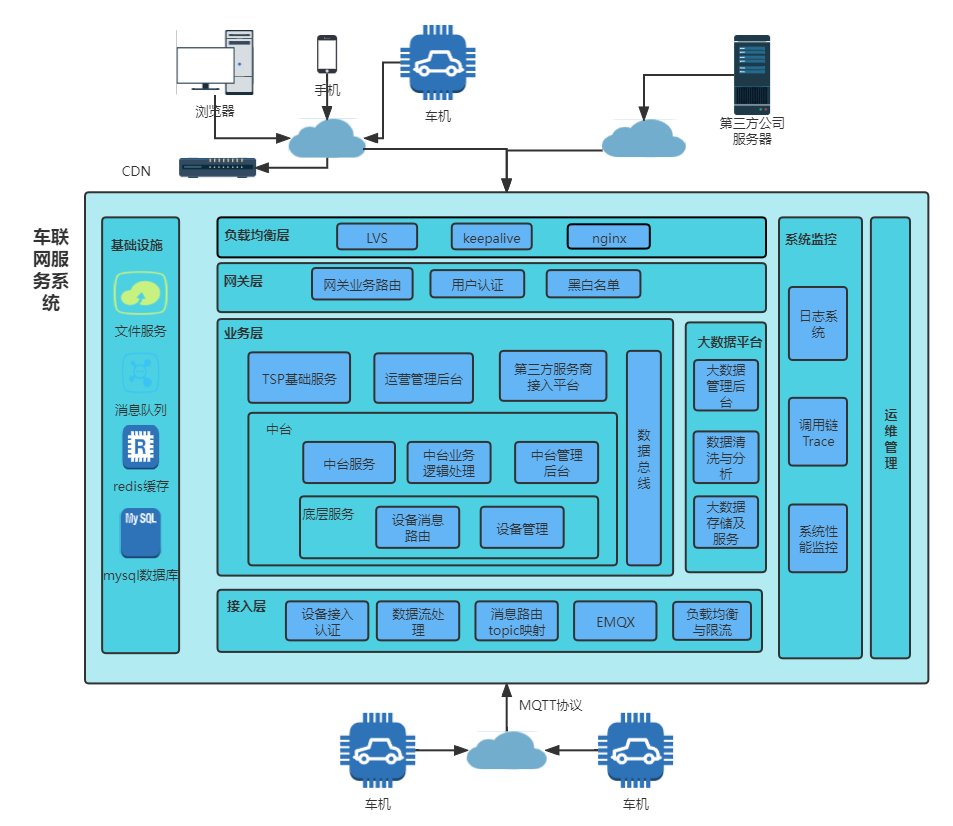 实现面向生产线、国家监控平台、企业自有平台、售后服务平台、其他业务平台提供核心车联网支持服务;