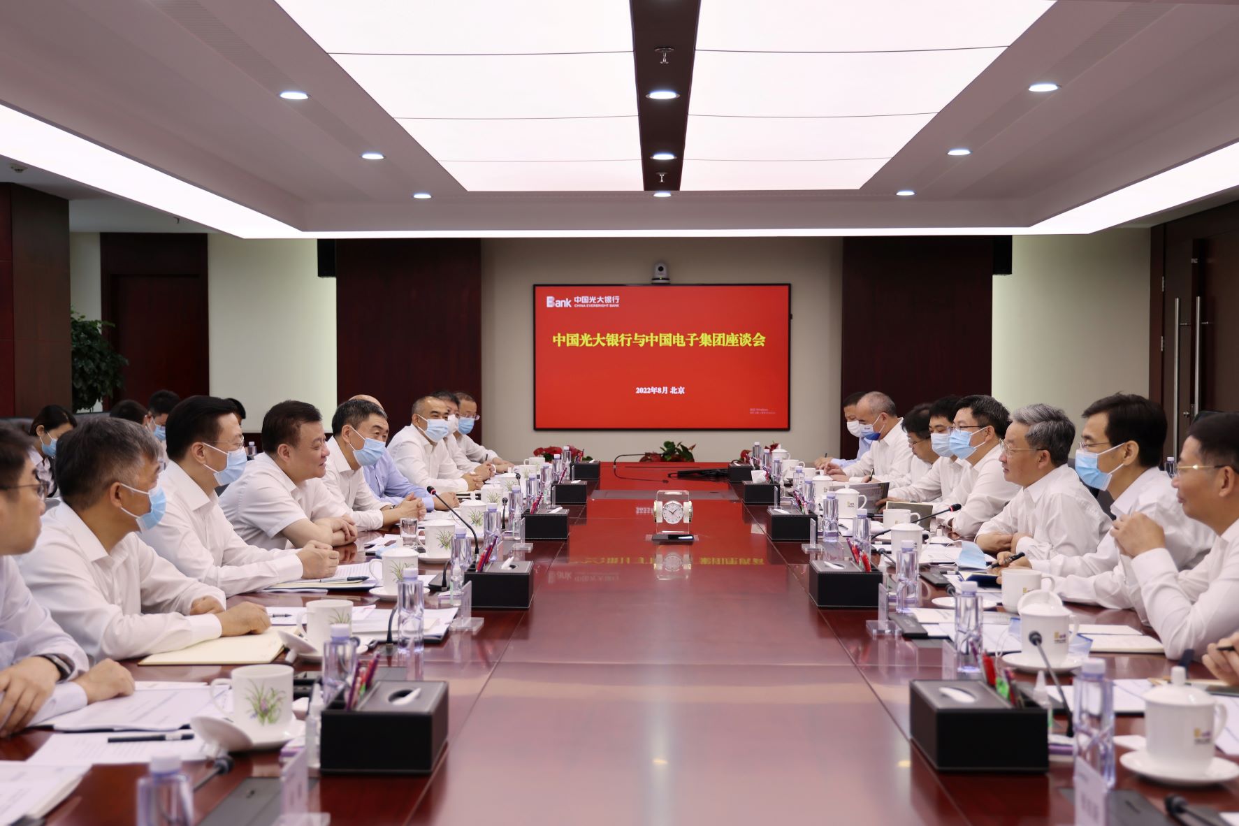 近日,中国电子党组副书记、总经理曾毅会见中国光大集团党委书记、董事长兼中国光大银行党委书记、董事长王江,双方就进一步夯实金融及科技领域合作进行座谈交流。中国电子党组成员、副总经理陈锡明,中国光大银行党委副书记、行长付万军参加活动。