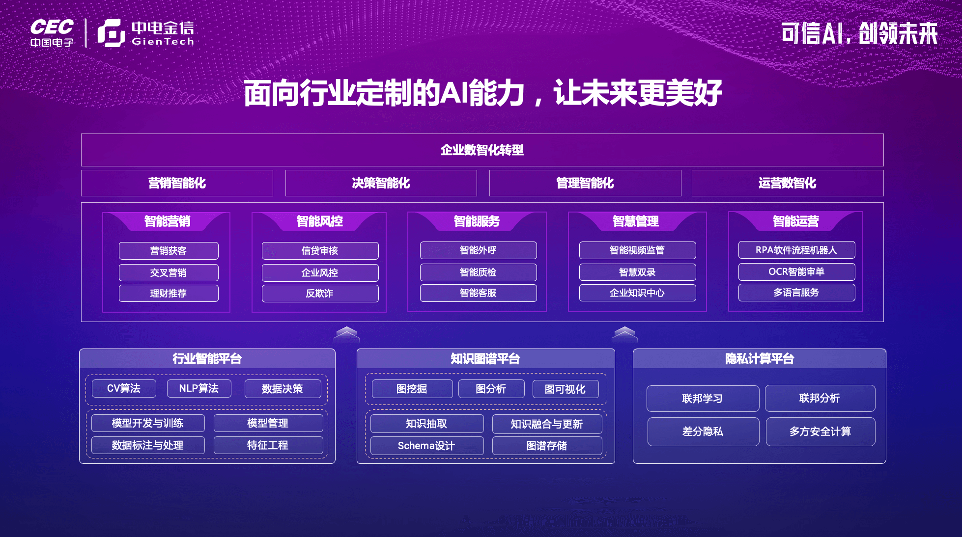作为中国电子旗下成员企业,中电金信基于安全、先进、绿色的PKS自主安全计算体系,为行业提供自主创新的数字化解决方案。在AI领域深耕积累,中电金信三款AI新产品“模法师机器学习平台”“鲸图知识图谱平台”“鲸Bot RPA”经过场景验证与打磨,可以帮助企业全流程、一站式构建AI能力,助力企业实现决策智能化和业务流程自动化。