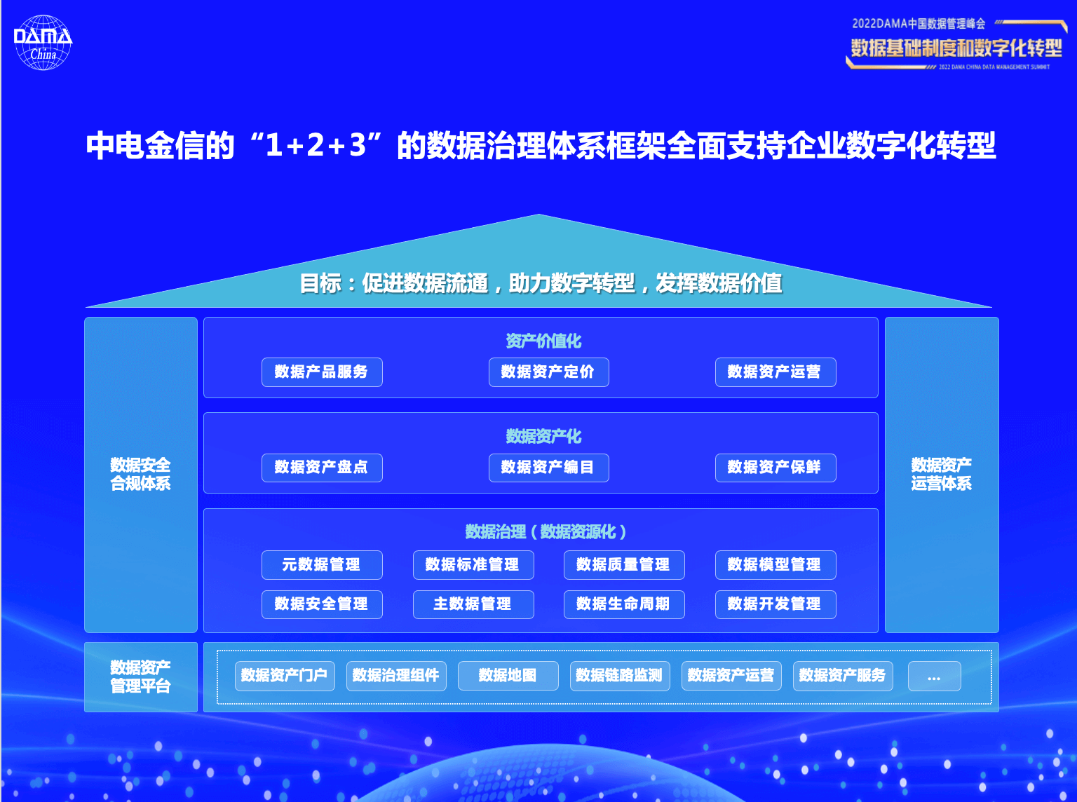 中电金信在保证数据信息安全前提下,积极拓展新技术实践和业务场景应用,推出“1+2+3”的数据治理体系框架,全面支持企业数字化转型。