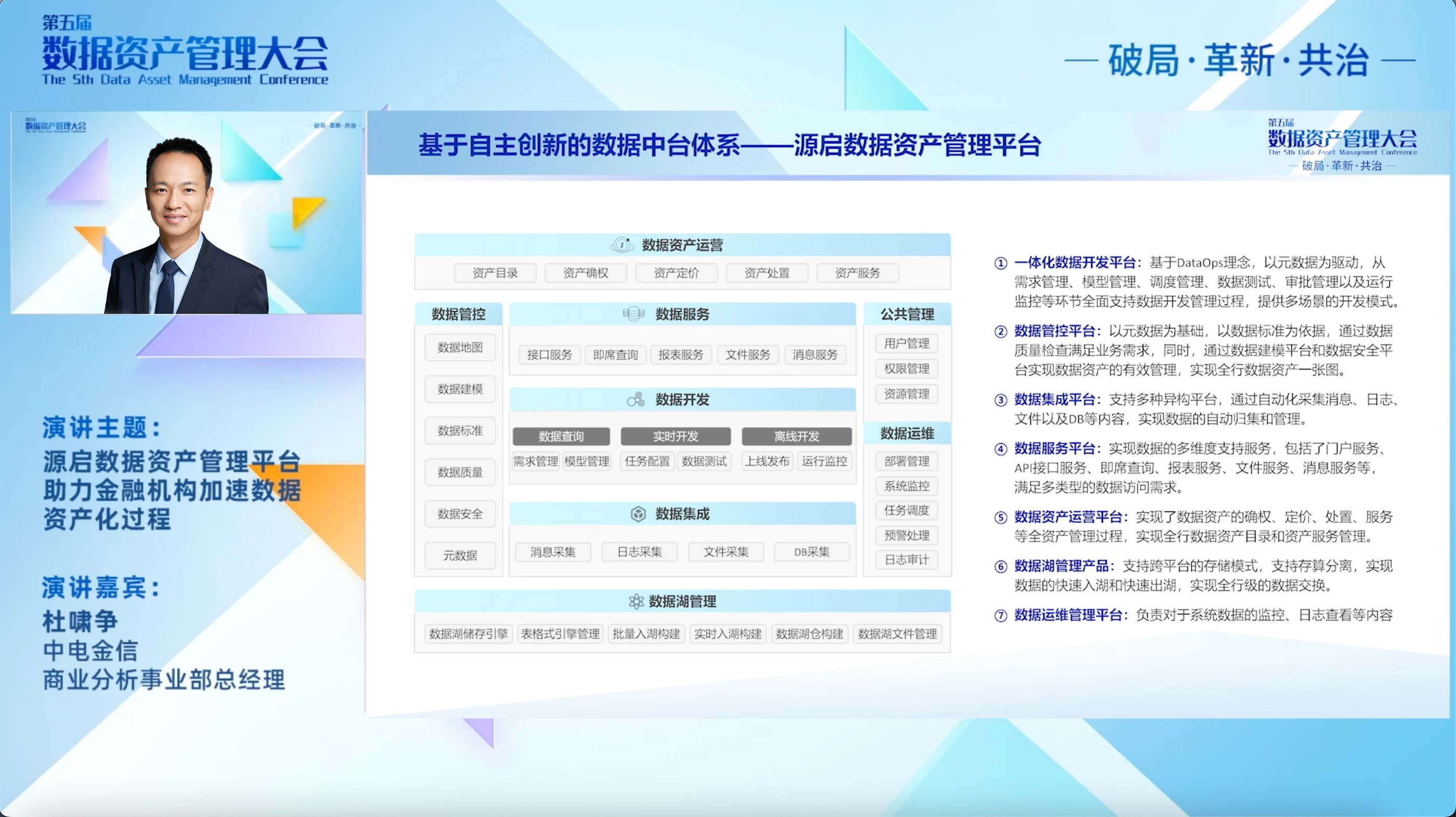 1月4日,在由中国信息通信研究院、中国通信标准化协会指导,中国通信标准化协会大数据技术标准推进委员会主办的“第五届数据资产管理大会”上,杜啸争详细介绍了中电金信大数据业务最新产品“源启数据资产平台”。