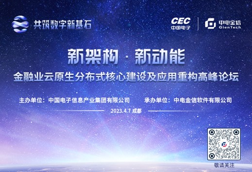 4月7日,由中国电子主办、中电金信承办的“新架构·新动能——金融业云原生分布式核心建设及应用重构高峰论坛”将在成都举办。