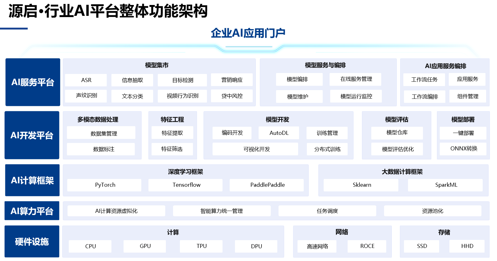 涵盖AI算力平台、AI计算框架、AI开发平台以及AI服务平台四大产品组件,是一个企业级的具有AI能力集中化生产和运营管理的平台型工具,帮助开发人员进行规模化模型开发,实现企业对模型和资源的统一管理和维护。迄今为止,源启·行业AI平台已累计参编了多项标准,包括国际标准、行业标准以及多项AIIA团标,并在30多家金融机构及5家非金融机构中广泛上线应用,成功助力客户开发并上线了500余个AI模型和应用。