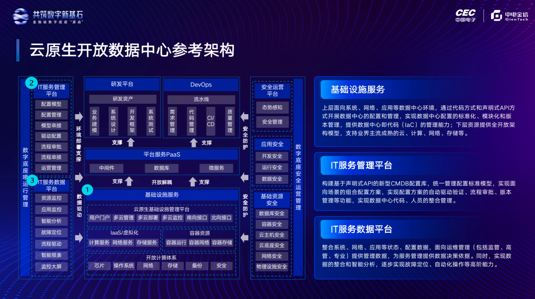 “云原生开放数据中心参考架构包含了基础设施服务、IT服务管理平台、IT数据管理平台,可以为金融行业带来三方面价值?!绷蹶坎龅??!?strong>第一,中电金信云原生开放数据中心参考架构开放解耦。银行可以继承内部数据中心用的技术栈,在此前的技术积累之上二次创新;第二,对于企业而言,提供了全栈自主安全的技术栈,就连组件也可以实现按需定制,且通过组件厂商的开放合作,实现技术栈的开放、持续运营。第三,依托中国电子自主计算产业链,中电金信可以为客户提供整个全产业链的专业支撑,实现产业协同。”