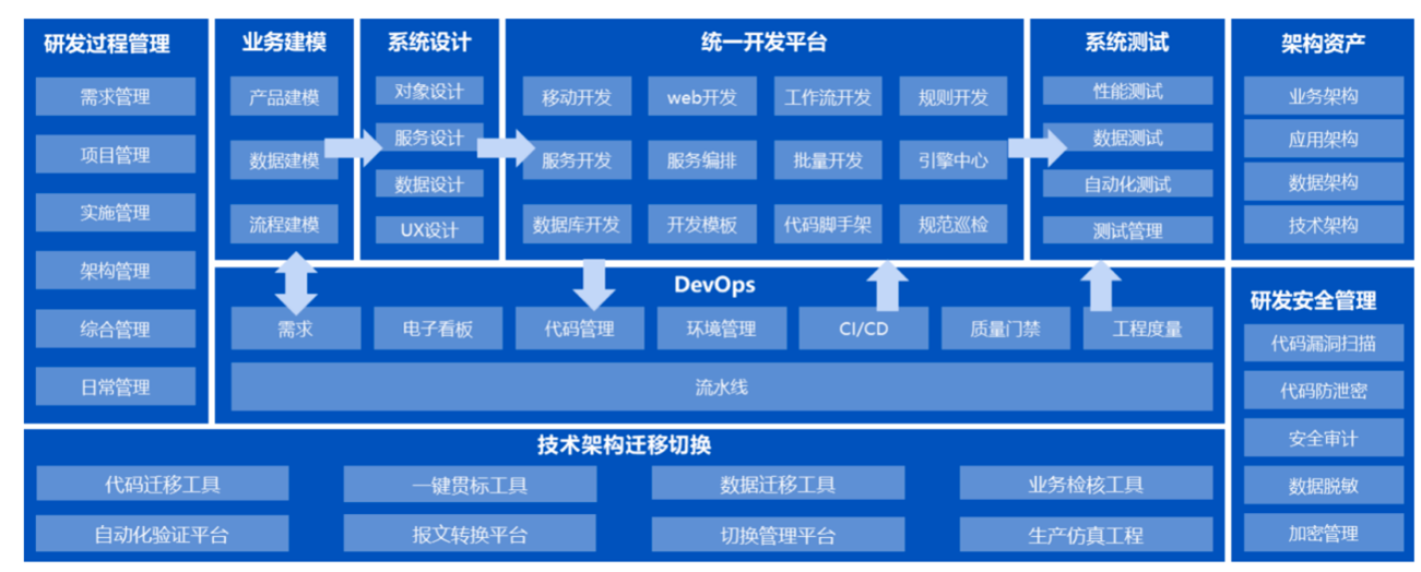 源启·数字构建平台主要由业务建模平台、统一设计开发平台、系统测试平台、DevOps和贯穿整个IT开发的研发资产管理、研发安全管理,以及架构资产平台及支撑架构迁移切换工具组成。