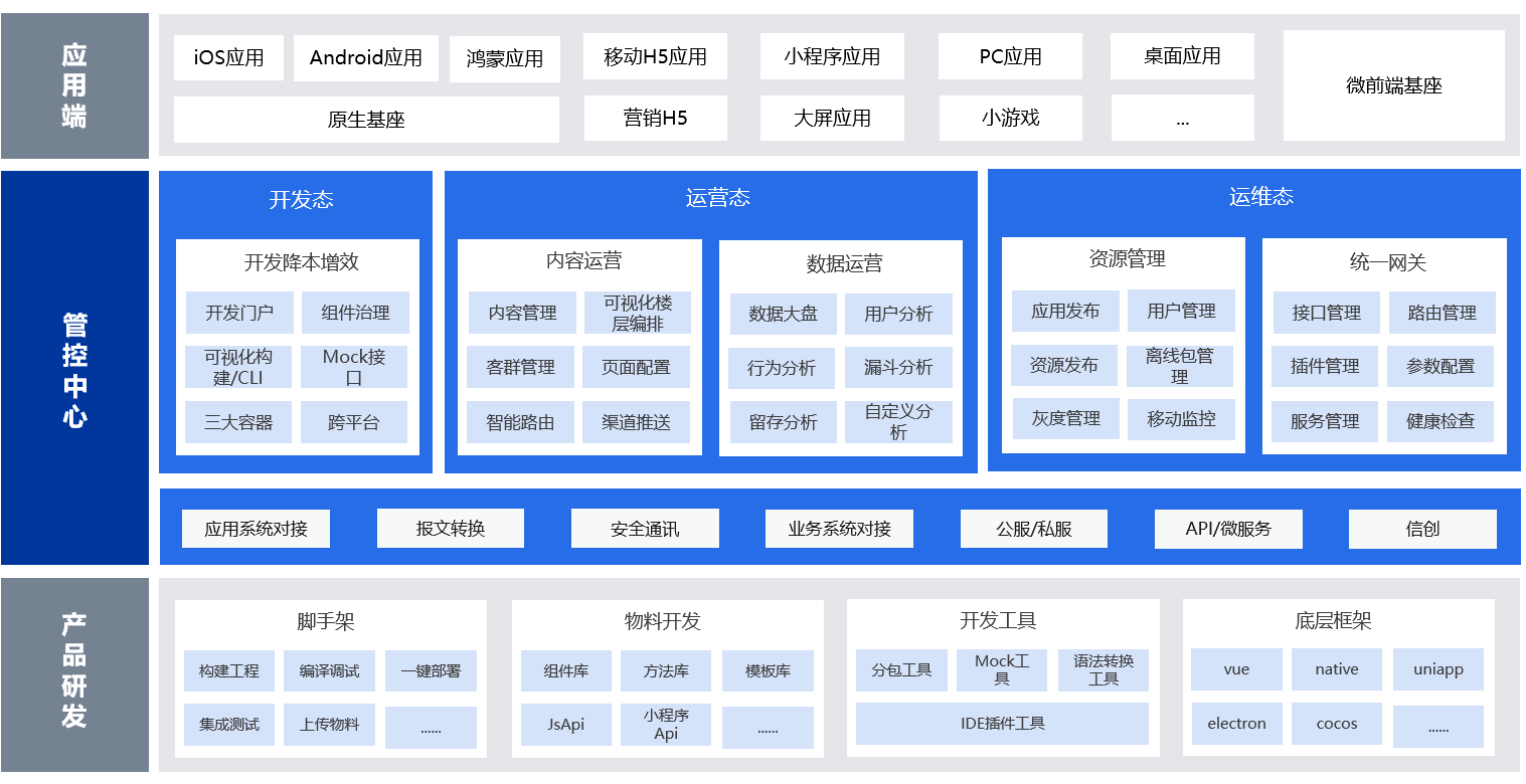 开发效率低,资源成本高人员构成复杂,开发规范不同意,导致代码质量低; 多渠道应用,需开发多套组件和API,人力成本大,效率低; 开发工具欠缺,编码效率低,手动构件工程、打包慢; 传统开发模式纯原生开发多端,一个APP至少4-5个team,人力成本高