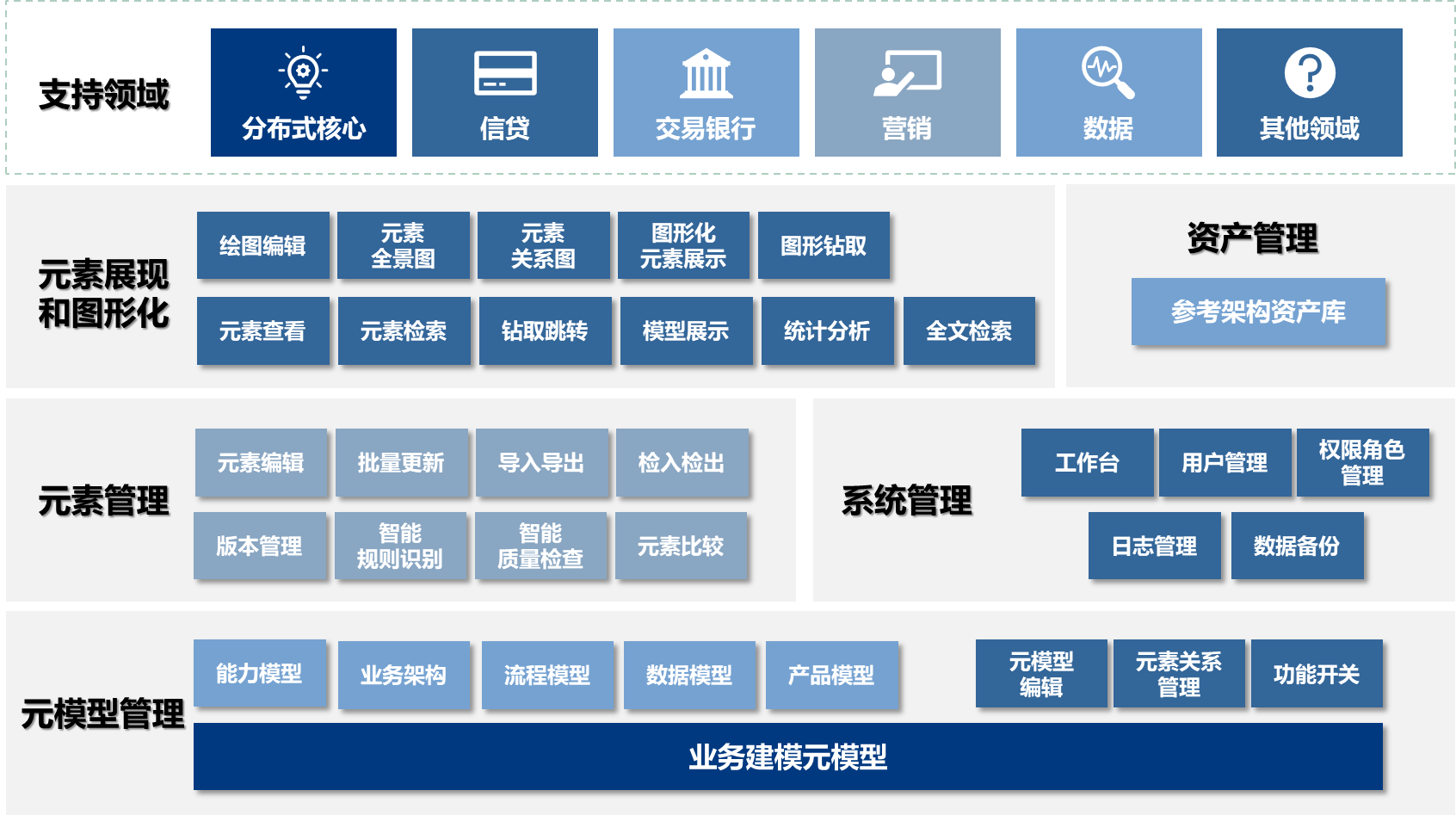 · 形成业务建模资产库,支持业务建模成果的存储和多维度展现。
