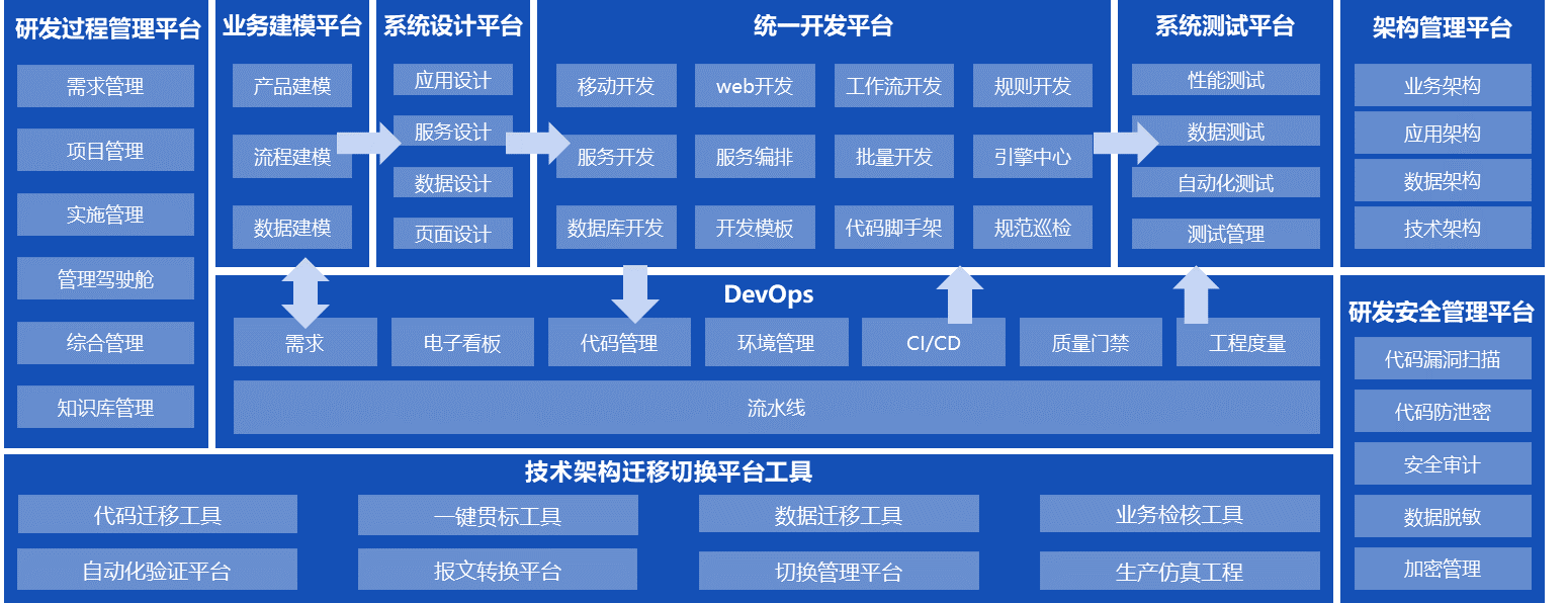 以企架引领的业务建模驱动软件工程创新,基于一体化工具链+工艺提供大规范应用集群的构建、迁移和治理能力。