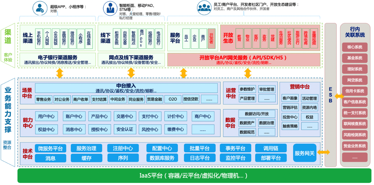 ???数字银行业务中台,为个人及企业手机银行、网上银行、直销银行、微信银行、聚合支付收单、智能设备、自助渠道、外部合作伙伴等多渠道提供业务支撑,实现对基础能力的包装与组合,同时有力支撑开放银行生态场景建设。