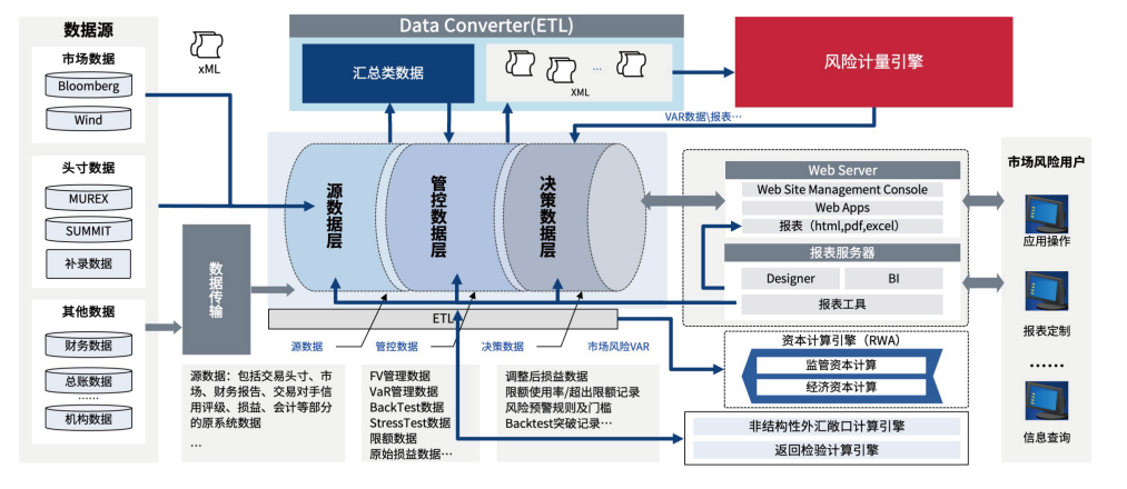 中电金信市场风险综合管理平台基于Basel协议FRTB资本新规,以满足市场风险监管要求为主旨而设计开发的市场风险综合管理系统,采用分布式架构、大数据及内存计算技术,内置风险计量引擎,具备市场风险数据分析管理、资金产品估值计量和风险监管数据报送等功能。帮助客户提升市场风险业务管控能力、金融市场业务经营能力、金融工具公允价值估值能力,为客户构建符合监管要求的市场风险管理数据体系与市场风险计量体系。