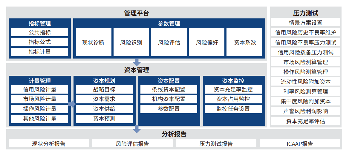 产品主要包括四大重点功能,分别是:资本管理、分析报告、压力测试和管理平台。