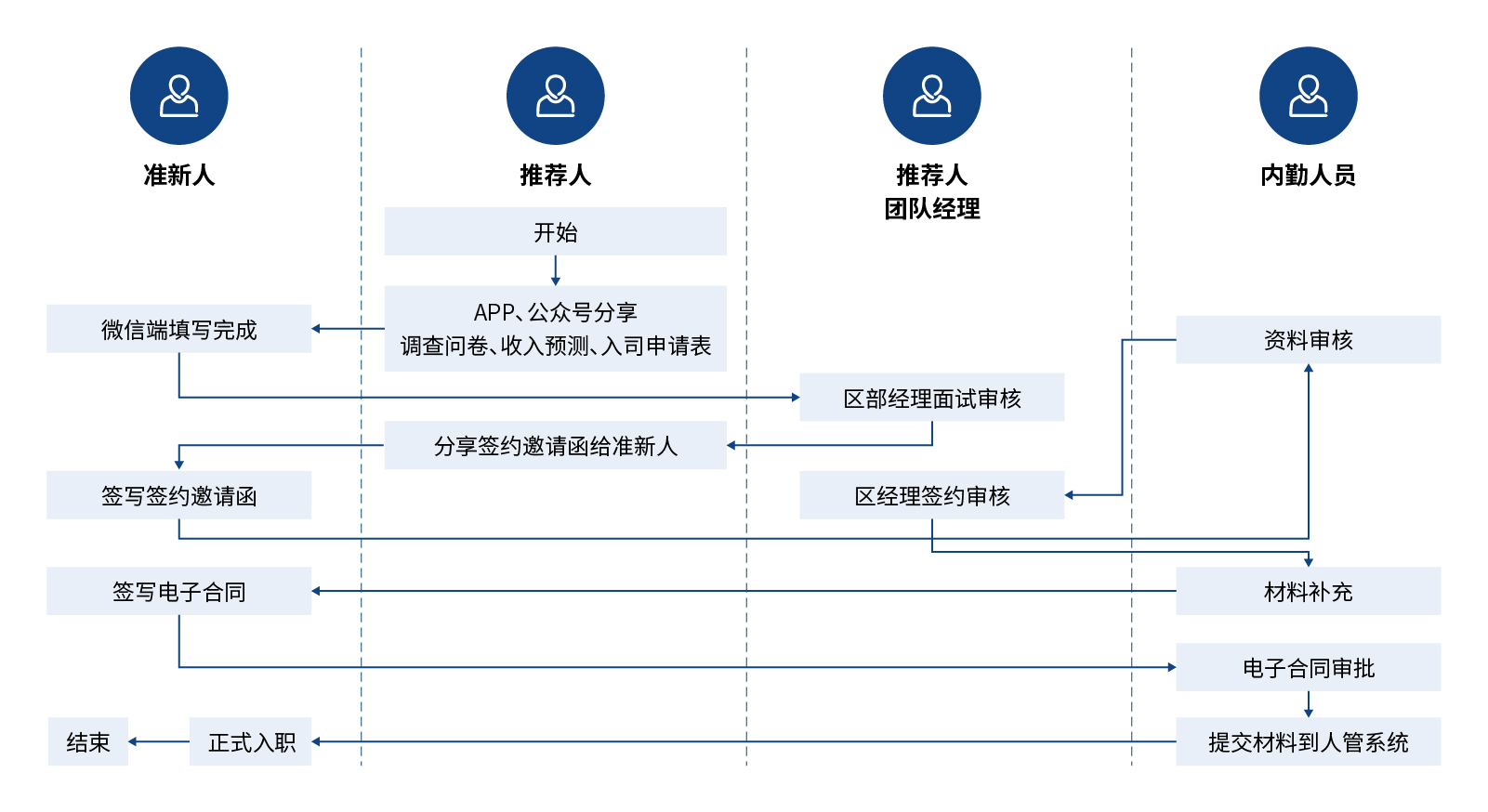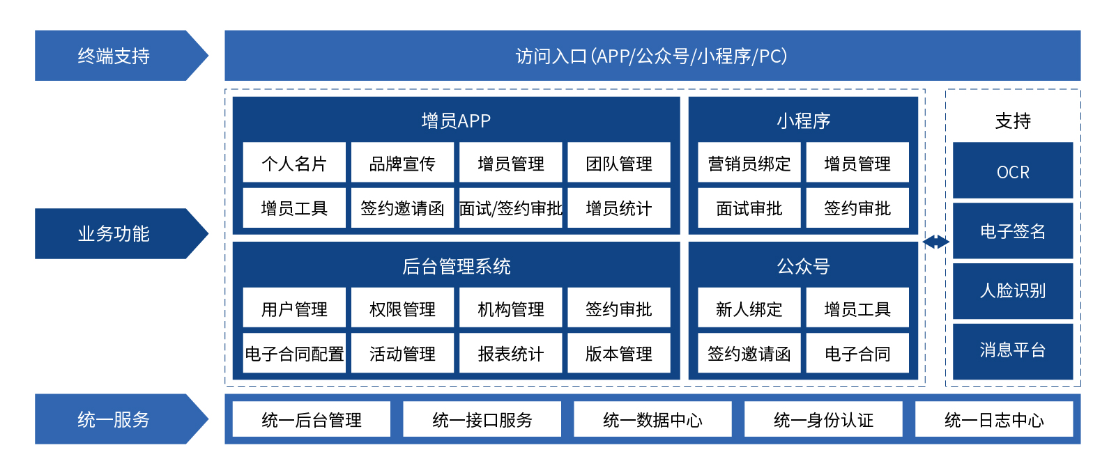 有队伍管理、增员管理、增员统计、增员工具、签约工具、面试审批、签约审批等功能;提供营销员入司的电子化招募全流程功能和增员信息管理功能,可嵌入销售支持APP,方便营销员使用。