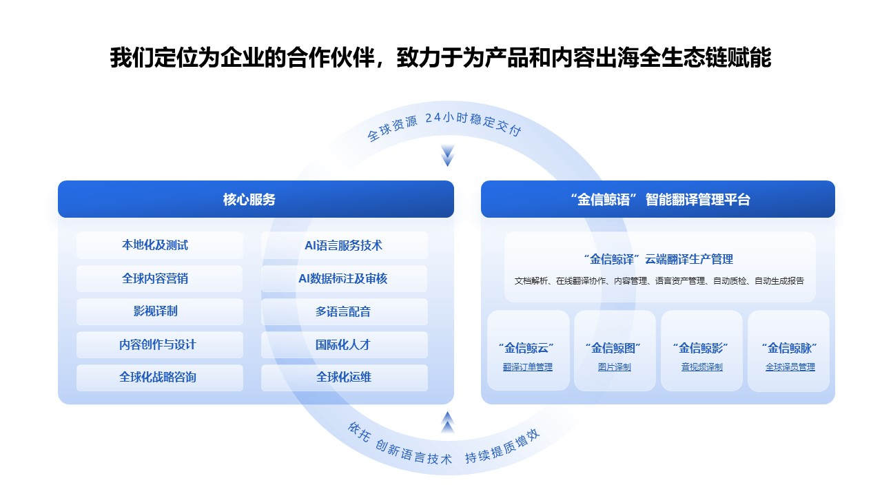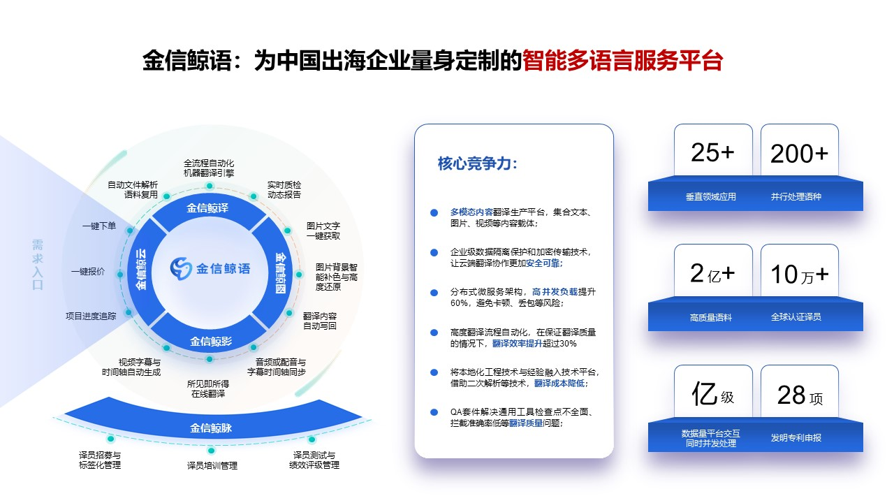中电金信面向大文娱、消费电子、电商零售、IT软件、汽车、智能制造、金融财经、旅游等多个垂直领域出海企业,依托自主研发的“金信鲸语”智能多语言服务平台,以AI人工智能技术为核心,结合29年成熟的语言服务能力,围绕企业出海的多元化需求,提供超过200种语言,贯穿本地化及测试、内容制作设计、多语言数据服务、全球化战略咨询、国际化人才、AI语言技术服务等全流程的“平台+服务”一站式多语言解决方案。通过离岸和在岸两种交付方式,助力企业打破全球化战略实施过程中的语言和文化障碍,凭借精准地道、生动且富有感染力的多语言内容制胜国际市场。