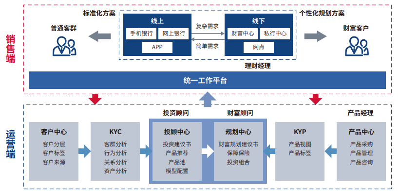 从以产品销售为中心的卖方销售,到资产配置、投资顾问为核心的买方投顾的模式转变;国内银行机构普遍对投资市场研究不足,难以满足客户日益强烈的资产配置需求,投研能力和投顾能力都较为滞后;产品销售能力和服务水平更多依赖于网点人员的个人能力,水平参差不齐,工作效率低下、客户体验差。