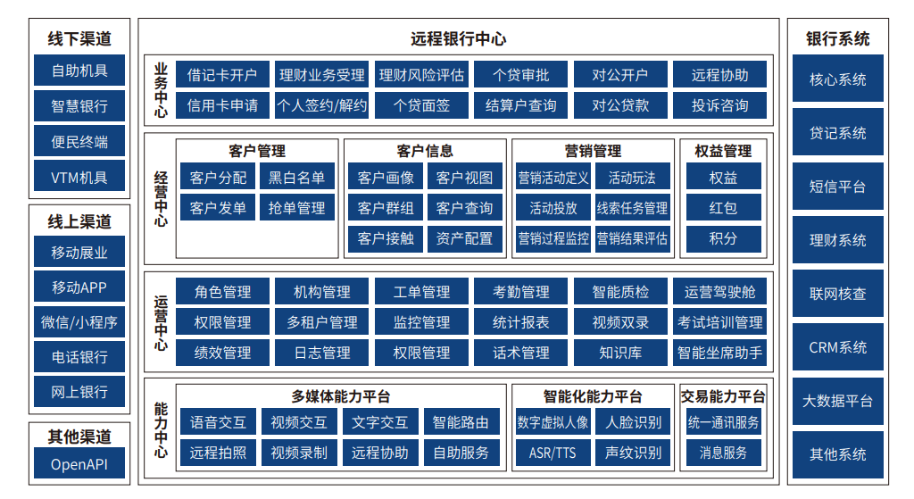 以客户服务和客户经营为宗旨,应用金融科技,打破时间和空间限制,实现全时全域、全渠道接入、全媒体触达、全业务保障的一体化解决方案